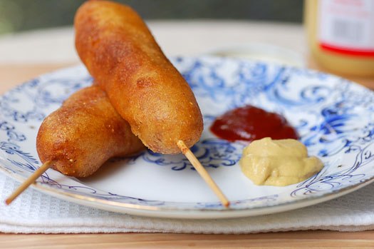 4. Нанизать сосиски на палочки и окунуть каждую в смесь, чтобы тесто полностью их покрыло.